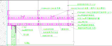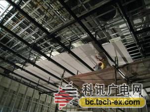 从图1可以看到,为了防止墙面微小孔隙对隔声量的影响,通常会在原墙体外增加20mm后的水泥砂浆扇灰,然后留100mm的空腔以增加对声音低频部分的吸收。通过把玻璃丝棉固定在横撑龙骨上,来控制混响时间的高频部分。图2为演播室房顶的声学结构大样图,它分为隔声层及吸音层两层,上层通过轻钢龙骨及次龙骨把隔声层固定。隔声层是由超细玻璃棉及错缝拼接的双层石膏板构成,以隔绝天花以上及空调的噪声。它的下层100mm位置,通过喷塑钢丝网固定50mm厚的玻璃丝棉起到对混响时间控制的作用。由于通常对演播室防火安全要求为A级,故选用玻璃吸声棉以及难燃的玻璃纤维布,作为主要的吸声材料。