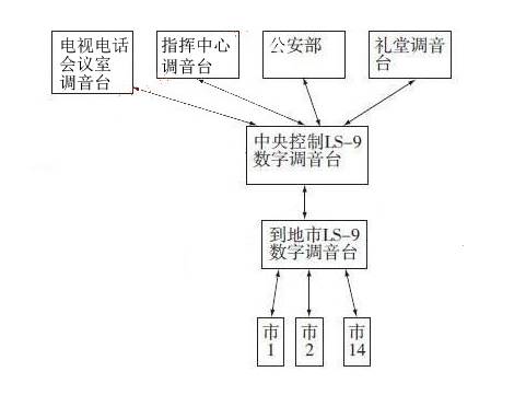 首先在信号汇集点图像控制中心放置两台LS-9,其中一台用来汇集各个会场以及公安部的音频信号,另一台用来接收和发送各市的音频信号;其他每个会场放置一台普通的调音台即可,用于与中心交换音频信号,如图1所示。