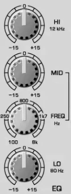 高频段和低频段的极限频率为12千赫兹和80 赫兹。对中频范围调音台有一个半参数型音质调节,适用于100赫兹至8千赫兹之间。用MID调节按钮提高/下降音量,用FREQ调节按钮调节频率。