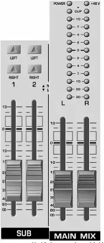 这些接口与MAIN OUT(主输出)平行,提供不平衡式的立体声总和。请您在此连接录音机的输入端。最终的音量通过高精密的MAIN MIX推杆调节。
