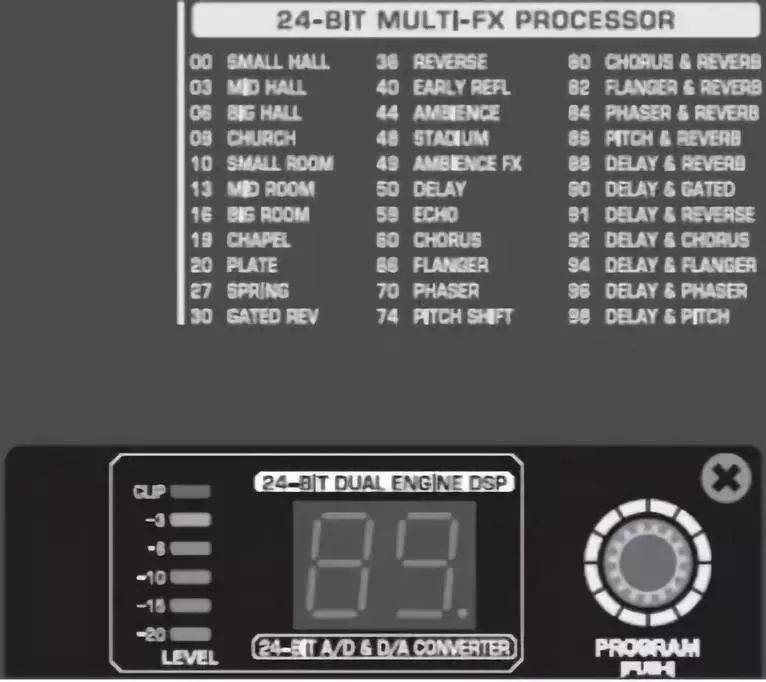 调音台提供了一套24-BIT MULTI-FX PROCESSOR多重效果处理器。这个内置的效果模块提供高质量的标准效果,如厅堂、合唱、镶边、回声以及各种组合效果。