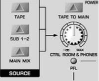 如果按下了CD/TAPE TO MAIN开关,双轨输入端便接到主混音上。这样CD/TAPE INPUT 可被用作磁带音源输入、MIDI 乐器或其他不需加工的信号源的附加输入端。TAPE TO MAIN 开关同时用来分离Main Mix 与CD/TAPE OUTPUT 的连接。