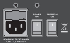 通过PHANTOM 开关您可启动单声道XLR 插孔的幻像电源,使用电容式麦克风需要幻像电源。红色的+48V 发光二极管发光时表示幻像电源已接通。如果使用平衡式电线的话,通常还可同时使用动圈麦克风。