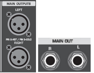 MAIN输出端用来输导MAIN MIX信号,配有平衡式XLR 插孔,其额定电平为 +4dBu,同时还有平衡式6.3mm插孔,同样供主总和信号输出使用(1622FX: 这里插口输出端位于正面面板上,为不平衡式)。