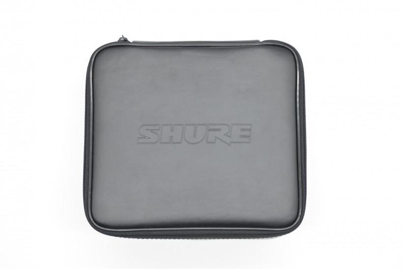 正面为Shure的logo,由拉链打开,箱体内部的外层为一层有一定厚度的海绵,内部由一块硬泡沫填充,开了两个槽位,分别完美放置PGA27的话筒本体以及它的减震架。可以说,话筒和减震架放在这个收纳箱中会非常安心,并且这个收纳箱也有能力抵挡一些颠簸状况。