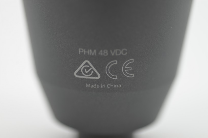 话筒背面的底部位置,写着PHM 48VDC,就是该话筒需要48V的幻象电源驱动的意思,下面还有CE认证等,再下面印着Made in China一行小字。