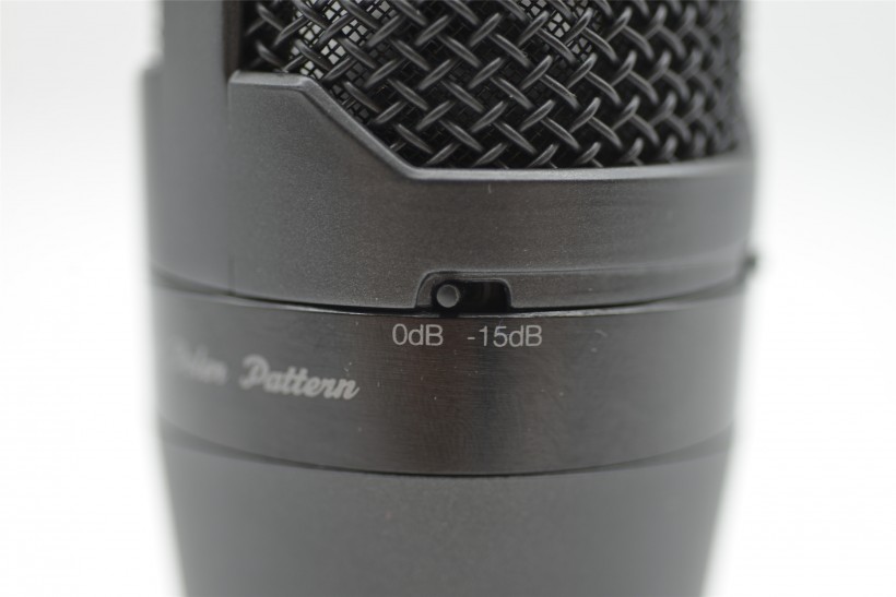在话筒背面还有两个开关,分别是-15dB的PAD开关与低切开关。-15dB用于来应对具有超大声压级的音源,比如高动态大声压的鼓时,就可以打开这个PAD开关。而低切可以有效减少一些不必要收录进去的低频环境噪音,当然如果你有一定后期制作能力的话可以不需要打开。