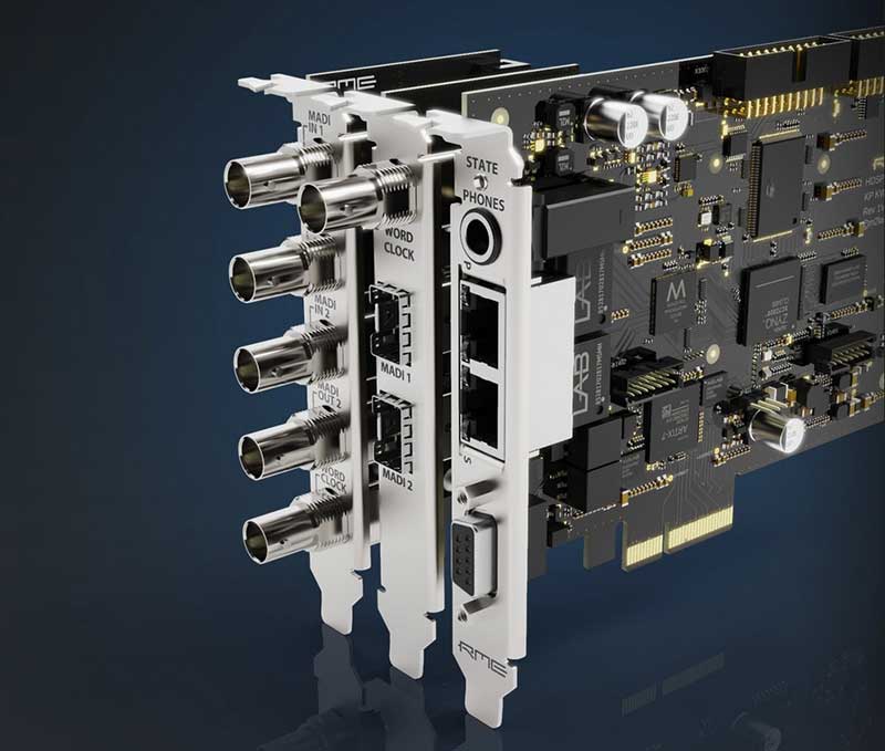 HDSPe AoX家族是HDSPe系列最新的PCIe x4的内置音频接口,具备双网络接口,还有耳机输出、AES3、MIDI和内部扩展接口,可以扩展出额外的四个MADI接口。不管你直接把它插在电脑机箱里,还是使用雷电的扩展槽连接到笔记本电脑,都可以给你最多512通道的混音和跳线通路。