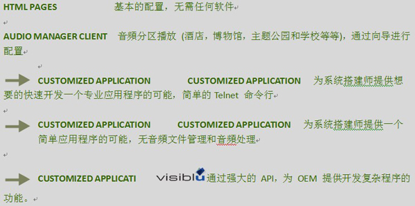 现今复杂的安装系统均要求接入多种格式的音源,Audio Manager 的核心引擎建立在 VisibluTM 基础上,这是一种网络音頻的操作系统。
