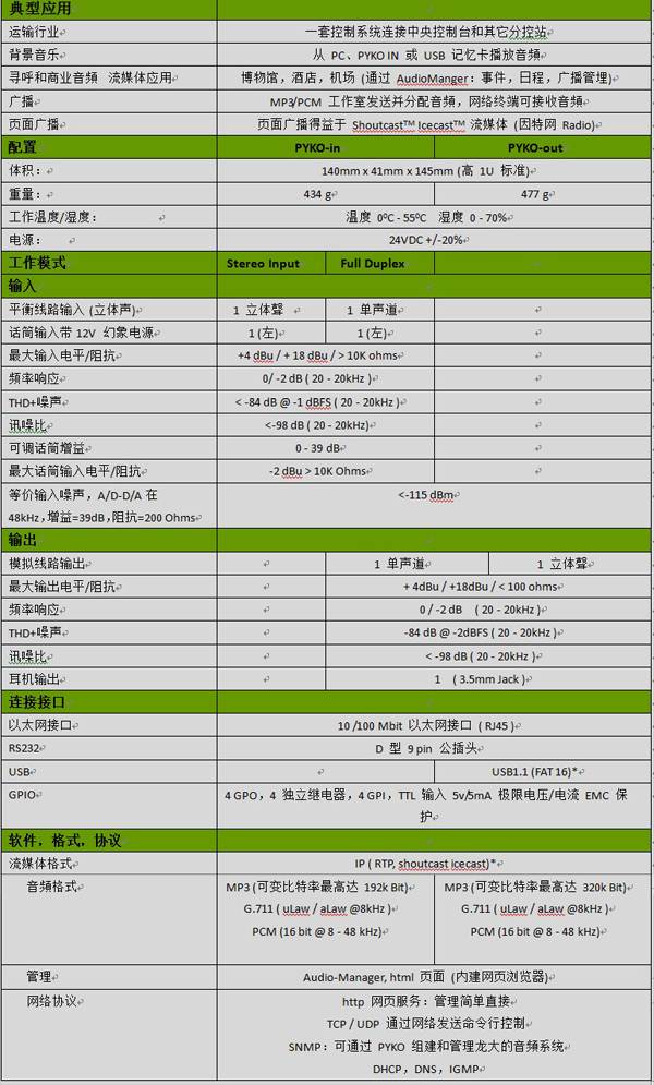 PYKO-in 将话筒 (带幻象供电) 和线路的模拟讯号,转成高质量的 MP3 或 PCM 的 IP 流,PYKO-in 可工作在 mono-in 或 mono-out 式的内通模式下 (使用 pcm 或 G711)。