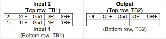 音频输入可能平衡或不平衡。 当使用不平衡电源时,将+输入馈入,并将负(–)输入跨接至GND。 使用单声道源时,将左右输入捆绑在一起,并观察正确的立体声相位。