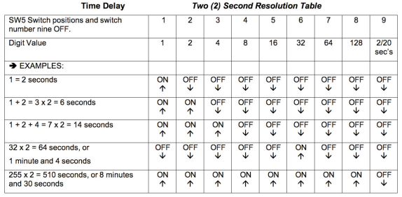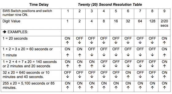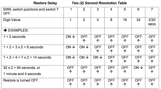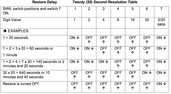 •拨码开关选择恢复时间延迟从OFF到21分钟,以20秒为增量。