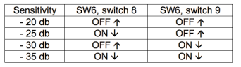 静音传感器的跳闸级别从零dBu开始。 拨码开关SW6上的开关8和9用于设置静音传感器跳闸级别。 出厂默认设置为两个开关均为OFF(-20)。 对于大多数安装,我们建议将跳闸级别设置为-25。
