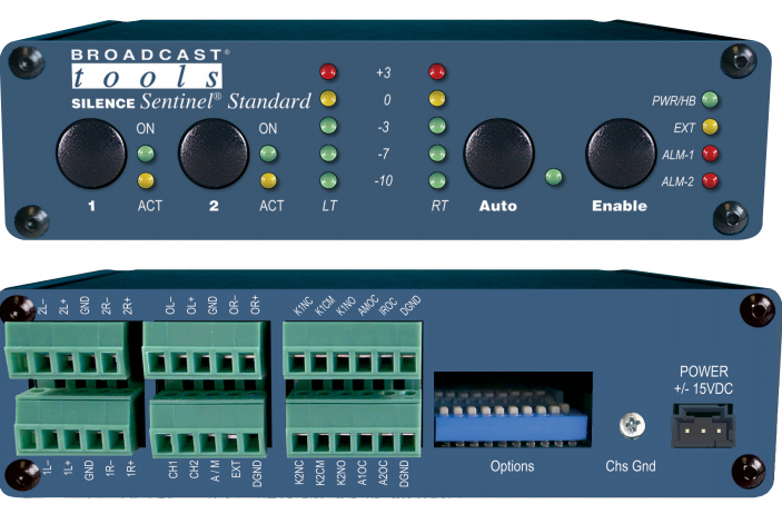BroadcastTools®SilenceSentinel®Standard旨在监视任何两个立体声模拟音频源的静音或异相状况,极性,产生警报,并使用机械闭锁继电器透明地切换到备用源。 其他功能包括:前面板控件,遥控器输入和状态输出; 插入式欧规螺钉端子; 拨码开关选择零参考以下-20,-25,-30和-35db的静音检测; 精确的警报定时延迟从关闭到85分钟; 精确的恢复时间延迟从关闭到21分钟。SilenceSentinel®Standard可以放置在台式机上,也可以安装在墙上或可选的RA-1机架搁板上,以在1-RU中最多安装三个单元。