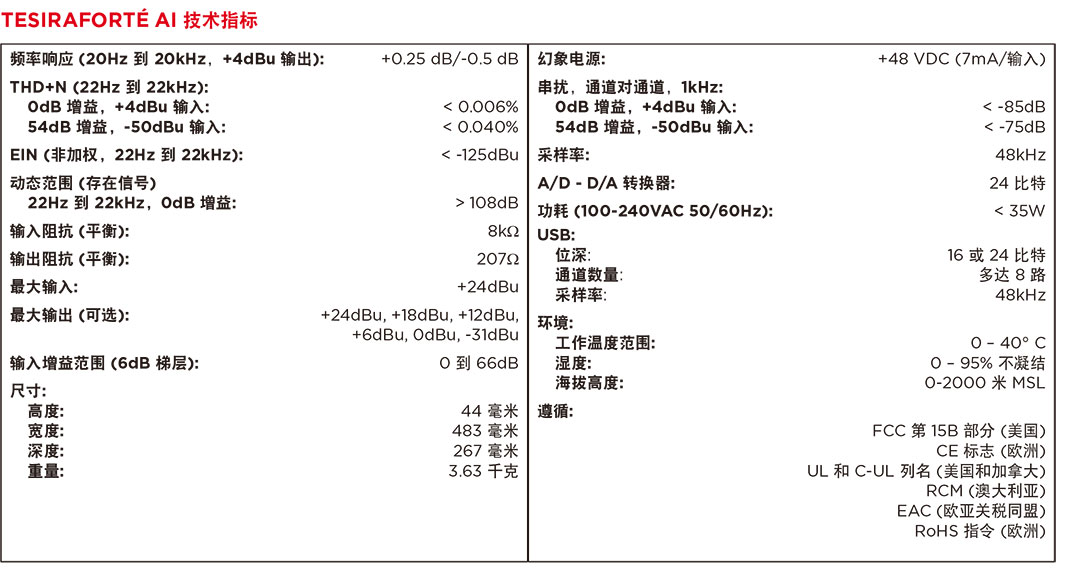 TesiraFORTÉ® AI是一款固定的I/O DSP,配备12路模拟输入和8路模拟输出,并包含多达8路可配置USB音频通道。借助USB音频,TesiraFORTÉ直接与USB音频主机连接,并可充分利用当今最先进的会议解决方案。TesiraFORTÉAI还提供了广泛的音频处理,包括但不限于:信号路由和混音、均衡、滤波、动态和延迟以及控制、监控和诊断工具,均通过Tesira软件配置。TesiraFORTÉ AI是中小型房间的最佳选择,这类房间需要使用语言扩声和分区扩声的高品质音频解决方案(如会议室或理事会会议厅)。
