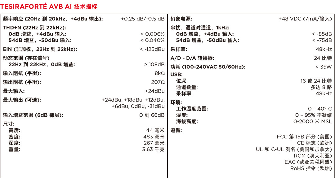 TesiraFORTÉ® AVB AI是一款固定的I/O DSP,配备12路模拟输入和8路模拟输出,并包含多达8路可配置USB音频通道。借助USB音频,TesiraFORTÉ直接与USB音频主机连接,并可充分利用当今最先进的会议解决方案。TesiraFORTÉ AVB AI使用音频视频桥接(AVB)数字音频网络、和可以用作独立设备,或与其他TesiraFORTÉ设备、Tesira DSPs、扩展器和控制器相结合使用。TesiraFORTÉ AVB AI还提供了广泛的音频处理,包括但不限于:信号路由和混音、均衡、滤波、动态和延迟以及控制、监控和诊断工具,均通过Tesira软件配置。TesiraFORTÉ AVB AI是中小型房间的最佳选择,这类房间需要使用语言扩声和分区扩声的高品质音频解决方案(如会议室或理事会会议厅)。