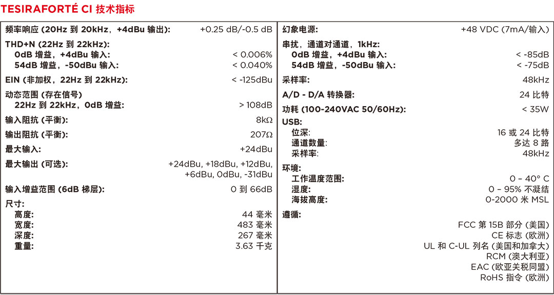 TesiraFORTÉ® CI是一款固定的I/O DSP,配备12路支持回声消除(AEC)的模拟输入和8路模拟输出,并包含多达8路可配置USB音频通道。借助USB音频,TesiraFORTÉ直接与USB音频主机连接,并可充分利用当今最先进的会议解决方案。TesiraFORTÉ CI还提供了广泛的音频处理,包括但不限于:信号路由和混音、均衡、滤波、动态和延迟以及控制、监控和诊断工具,均通过Tesira软件配置。TesiraFORTÉ CI是中小型房间的最佳选择,这类房间需要使用语言扩声和分区扩声的高品质音频解决方案(如会议室或理事会会议厅)。
