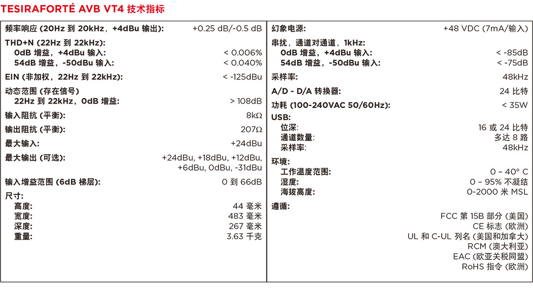 TesiraFORTÉ®AVBVT4是一款固定的I/ODSP,配备4路支持回声消除(AEC)的模拟输入和4路模拟输出,并包含多达8路可配置USB音频通道,一个双通道VoIP接口和一个标准FXO电话接口。借助USB音频,TesiraFORTÉ直接与USB音频主机连接,并可充分利用当今最先进的会议解决方案。TesiraFORTÉAVBVT4使用音频视频桥接(AVB)数字音频网络、和可以用作独立设备,或与其他TesiraFORTÉ设备、TesiraDSPs、扩展器和控制器相结合使用。TesiraFORTÉAVBVT4还提供了广泛的音频处理,包括但不限于:信号路由和混音、均衡、滤波、动态和延迟以及控制、监控和诊断工具,均通过Tesira软件配置。TesiraFORTÉAVBVT4最适合需要使用VoIP、放大声音、混音和AEC的高品质音频解决方案的房间。