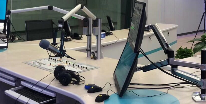 为了配合和适应当前广播直播系统融媒体,可视化的需求,对话筒支架需要重新认识和定义,需要拓展其应用,将传统的话筒架进行再升级,突出多种应用的设计。